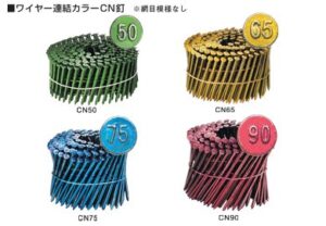 CN釘は2×4工法の建築に使われる釘で、N釘よりやや太めで、せん断強度に優れています。種類は4種類しかなく、それぞれ異なる色で塗装されているため、誤使用が起きにくく、打ち込まれた後でも検査が容易にできるように考えられています。太さの違いはN50が2.75ミリに対してCN50は2.87ミリと少し太めに作られています。