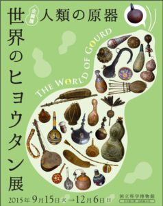 ラジオの深夜番組で瓢箪(ひょうたん)の興味深い話を聞きました。それによると瓢箪は一万年も前から栽培作物として世界に広がっていたということ、日本 でも9600年前の地層から瓢箪が出ている事、アフリカ原産ですが、ほぼ1万年前にはアメリカ大陸にもにも伝わっていたことが分かっていたそうです。面白そうでしたので、国立科学博物館で開催していた右記展覧会に行ってまいりました。