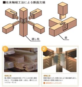 木材は粘りもあり強度に優れたた材料ですが、左の図のように通し柱に4方から柱が挿さるような場合は柱の欠き込み部分が多くよほど太い柱を使わないと折れてしまう場合もあります。