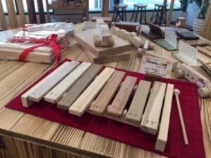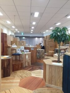 こちらでも、月1回のペースで無垢木材を活用して木に触れ合うイベントを開催しており、子どもたち向けのワークショップが行なわれているようです。弊社の1Fで行っている教室の参考になりました。