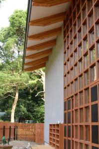 四方に開いた窓からは、深い軒先を潜り抜けた優しい光が入ってきます。北側の大きな格子状の窓も優しい光の取り入れ口であり、公園の広い芝生の庭とのつながりにもなっています。