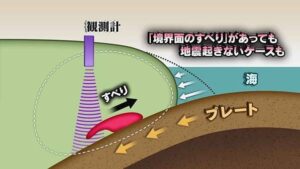 地震予知が出来ると考えていた根拠は図のような地盤のひずみが地震の前に少しずつ滑り始まりその滑りを観測することで、2~3日前には予報が出せるということが前提でした。しかし、その後地震の研究が大きく進み、メカニズムや地下の岩盤の動きがわかるようになると滑りが起きても地震に結びつかない静かな地震といわれる動きがあり、地震を予知することが難しいことがわかってきました。