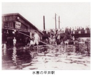 埼玉県の加須市付近の利根川が氾濫し、その水が約1週間かけて江戸川区まで届いたという事で、親の話によりますと、荷物や畳を2階にあげ小舟を用意して備えたそうです。この台風では利根川上流の足尾での降雨量は3日間で385㎜、荒川流域の秩父観測所では2日間で611㎜という大雨で、あちらこちらの河川が氾濫し土石流も起こり人的被害も出ています。この台風の被害は30,506戸の浸水と132,991人に及びました。写真は平井駅の様子ですがこんな光景が江戸川区のいたるところにあったという事でしょうか。