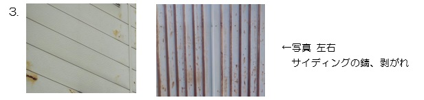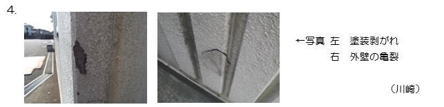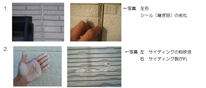時期としましては右ページ写真(1・2)のような症状がみられるとメンテナンスが望ましいです。方法としましては、シール部の劣化はシールの打ち直し、サイディング部は塗料の塗り替えが一般的ですが、足場を要することが殆どの為、同時に施工を行うことが望ましいです。