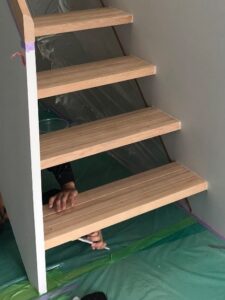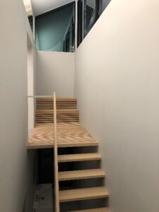 ルーバー上ですと強度的に厚みが必要になり、今回の薄く華奢に見せたい設計イメージと合わないことから、ルーバーと同じ幅の6枚の木材を貼り合わせた段板としました。さらに6枚の木材を貼り合わせる利点を生かし、6枚の木材の厚みを交互に変えて滑り止めのノンスリップとすることにしました。そのノンスリップの深さも実際にモックアップで0.5㎜、1.0㎜、1.5㎜を試作し、実際に足触りを設計・施主と確認しながら、最終的に0.8~1.0㎜のノンスリップで段板を作りました。