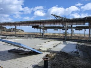 津波の被害も受けたJRの富岡駅では、バスを降り周辺を歩いてみました。ここもがれきは撤去されていましたが、駅のホームと駅前の旅館は写真のように津波で破壊されたまま残っていました。