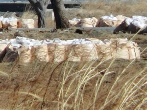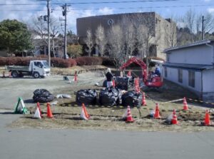 写真は、除染の様子と除染で出た土を仮置きしているところですが、色々なところで除染作業が行われ、仮置き場には土嚢(どのう)が並べられて、その上にシートがかけられて雨水等の侵入を防ぐ処置が施されていました。