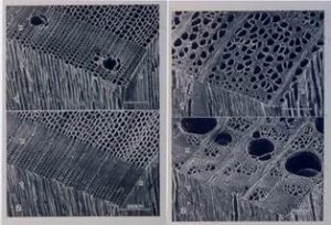 <左上・アカマツ、左下・スギ 針葉樹。右上・ブナ、右下・ケヤキ 広葉樹の顕微鏡写真。>